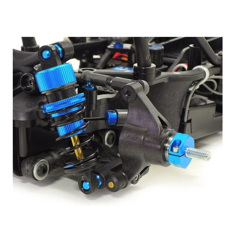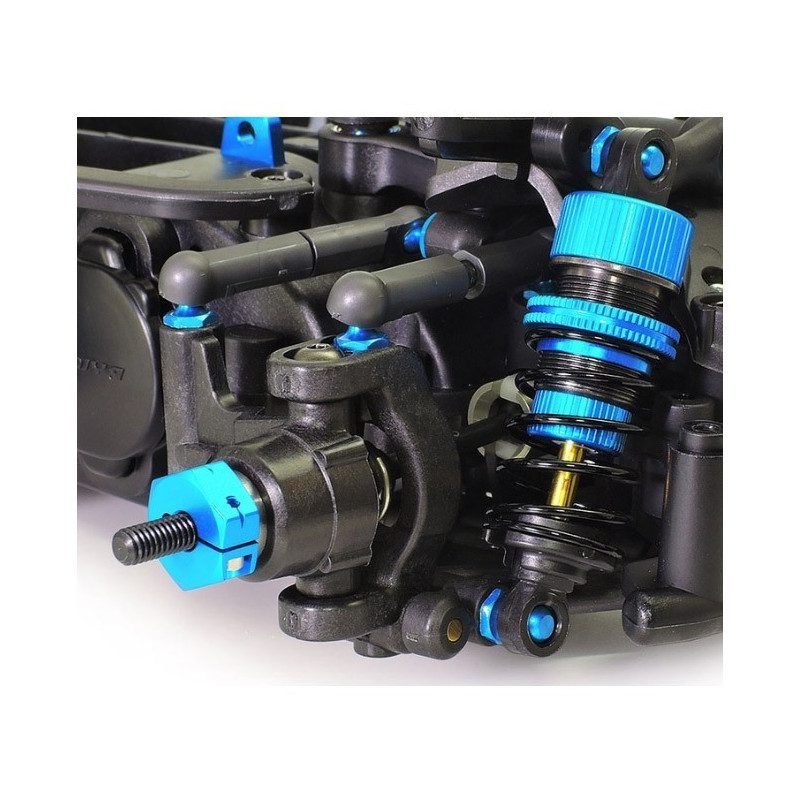 Version R du M-07 FWD : cardans double articulation 33 mm, coupelles alu, pignon 20T alu traité fluoré, amortisseurs TRF courts, supports batterie carbone, bras renforcés… Kit à assembler sans électronique. (47520)