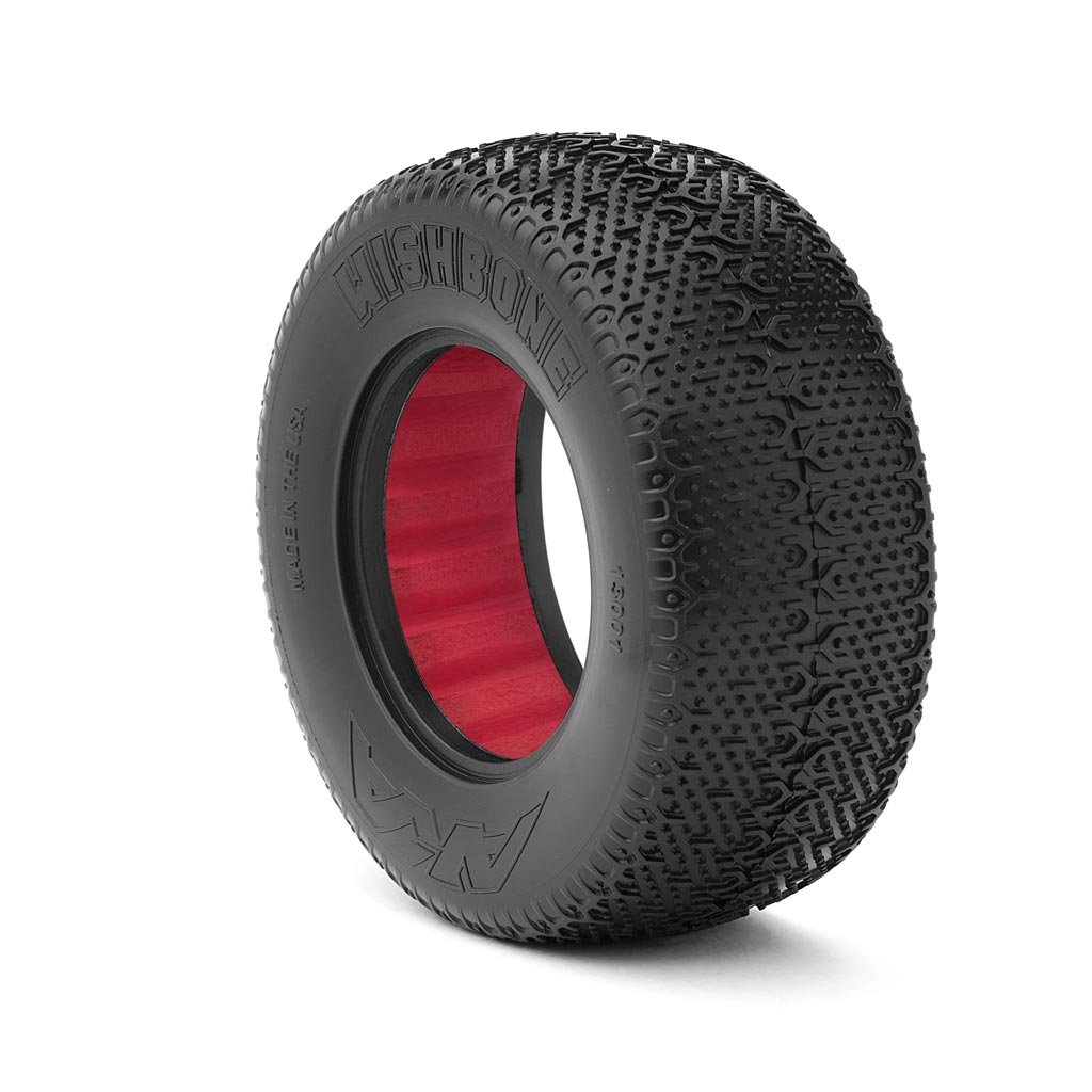 Cette paire de pneus 1/10 AKA Wishbone Short Course Soft (réf. AKA13001SR) avec insert rouge offre un excellent grip sur pistes courtes et mixtes.