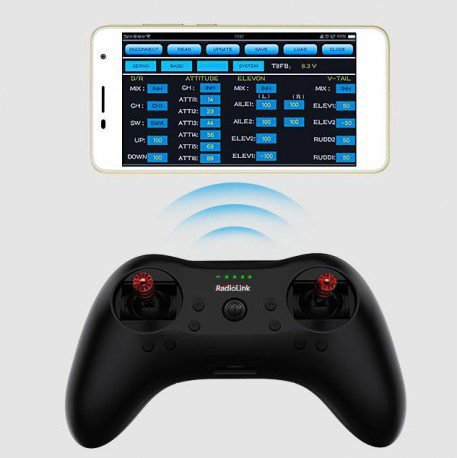 La puce sans fil du T8S est américaine de type TICC2500 avec un taux de transmission est 3 fois plus rapide que Open TX. Le même algorithme Spread spectrum FHSS que l’AT9S et le saut de fréquence pseudo aléatoire à 67 canaux assurent d’excellentes performances anti-interférences sur les mêmes bandes de fréquences et sur des bandes de fréquences différentes et une portée de 2000 mètres dans les airs.